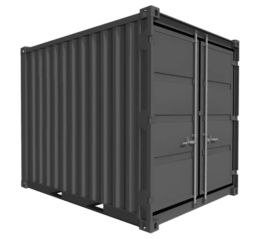Contêiner marítimo preto de 7 pés da Rhino-Cross-Containers, modelo 2025, com porta e janela.