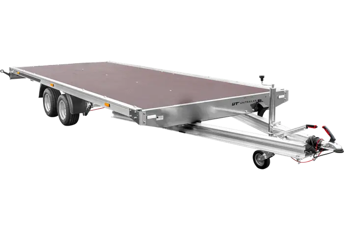 Veículo de recuperação com plataforma de alumínio de dois eixos UNIPLAT 600 ALU, 3500 kg GVWR, com rampas de carregamento.