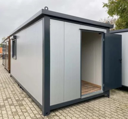 Quarto com dimensões de 264 x 256 cm. Pé direito de 227 cm. Banheiro com azulejos com dimensões de 229 x 128 cm. Todas as conexões estão presentes no banheiro, mas ele ainda precisa ser instalado e possui uma janela basculante. Todo o cômodo está equipado com diversas luzes de LED e vidros duplos, proporcionando isolamento acústico. A sala de estar possui duas janelas basculantes. Na parte externa, nos fundos, há uma conexão fixa de 400 V. O comprador é responsável pelo carregamento, desmontagem e transporte deste lote. Nenhuma ferramenta está incluída.