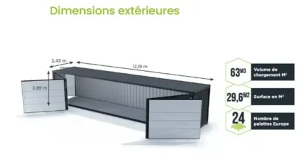 - Dimensões externas: 12,03 m x 2,43 m x 2,89 m