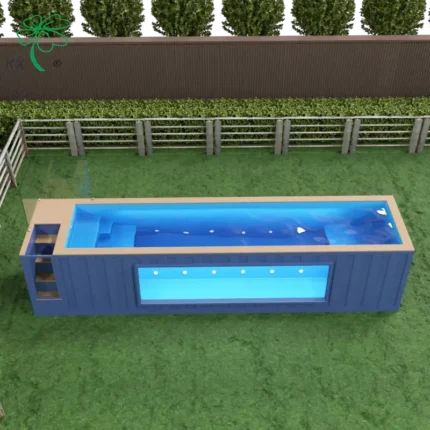 Piscina moderna e móvel, projetada a partir de um contêiner marítimo pré-fabricado . Possui estrutura robusta em aço, revestimento impermeável, instalação rápida, opções de janelas panorâmicas e equipamentos técnicos integrados. Ideal para jardins, terraços, hotéis ou projetos comerciais.