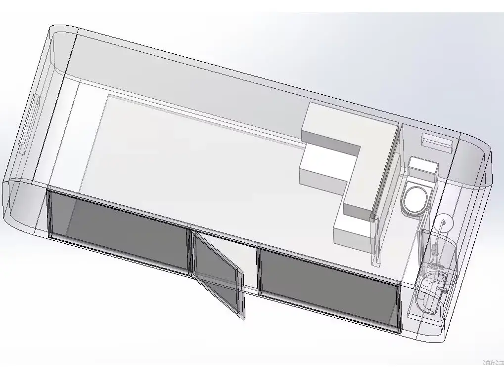 Energia : painéis solares no telhado, bateria de íon-lítio, possibilidade de conexão à rede elétrica.