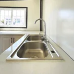 Banheiro compacto : chuveiro, vaso sanitário de baixo consumo e pia.