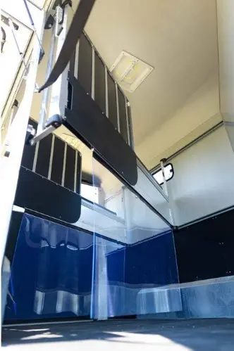A van oferece um interior espaçoso e bem ventilado para os cavalos, com soluções práticas para conforto e segurança: