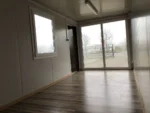 Contêiner habitacional de 6×2,43 metros Dimensões   – 6,00 m de comprimento x 2,43 m de largura x 2,80 m de altura, altura interna de 2,50 m. Estrutura metálica  –   paredes  trapezoidais – chapa metálica perfilada // lã mineral //  painéis de piso laminado. Instalação elétrica em PVC   – 380V, 32A, alimentação de 5 polos; 1 caixa de fusíveis e bloco de distribuição, 2 lâmpadas LED, 1 interruptor, tomadas duplas de 230V,  janelas e proteção solar   – 1 janela dupla / 200cm x 120cm e persianas de PVC,  1 porta   – 200cm x 90cm – Instalação elétrica completa com tomadas de 230V e luminárias de teto. – Piso de PVC – resistente e fácil de limpar – Piso isolado, interior com painel OSB – Radiador elétrico de parede de 2000 W – Construção robusta com estrutura autoportante em aço soldado.