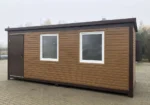 Contêiner de escritório com design em madeira, 6×2,40 metros, 2,70 metros de altura.