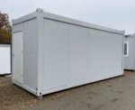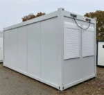Dimensões 6000x2400x2620 – Peso 2500 kg – Banheiro com pia e chuveiro – Mini cozinha com geladeira – Isolamento de paredes e telhados utilizando painéis sanduíche de 7,5 cm. – 2 janelas basculantes (vidro duplo) – Perfil sanduíche com isolamento térmico para baixa perda de energia – Porta exterior em chapa de aço Hörmann – Instalação elétrica completa em conformidade com as diretivas CE – Tomadas de 230V – Luminárias de teto LED – Piso laminado – resistente e fácil de limpar – Piso isolado, interior com painel OSB – Radiador elétrico de parede de 2000 W Aquecedor de água instantâneo 11KW/400V – Chuveiro redondo D90cm – Ilhós para descarregamento com guindaste – Guias para empilhadeira para transporte fácil e seguro – Construção robusta com estrutura autoportante em aço soldado. Também podemos produzi-los a qualquer momento de acordo com as suas especificações, em outras dimensões e cores, ou com banheiros ou outras instalações.
