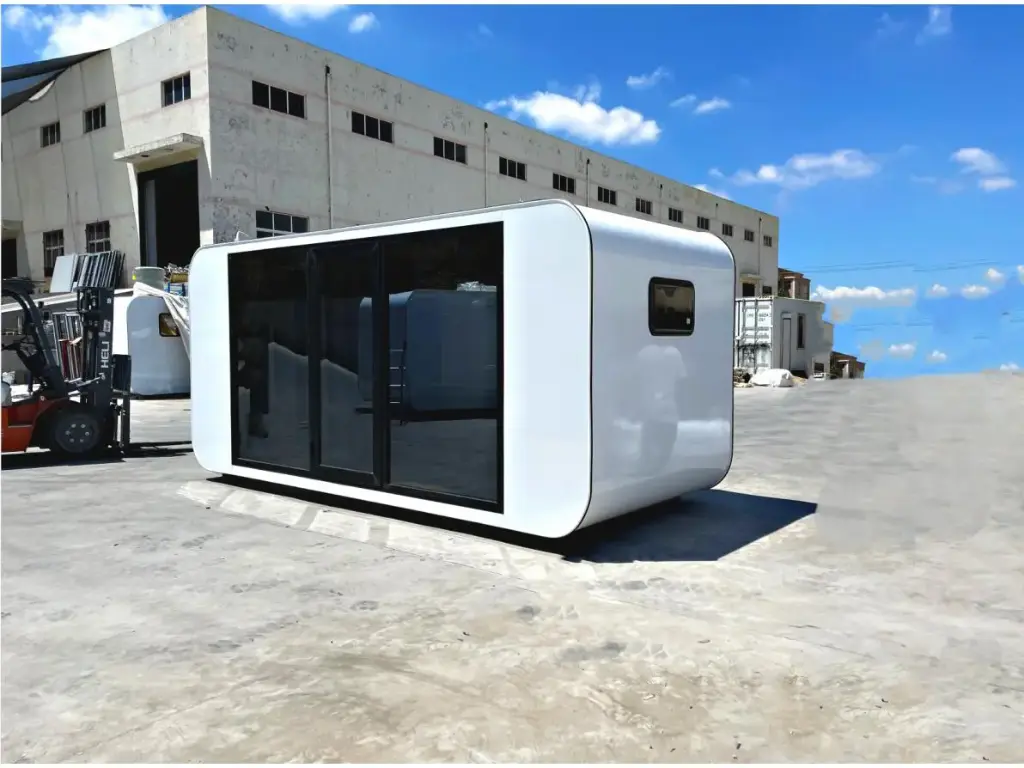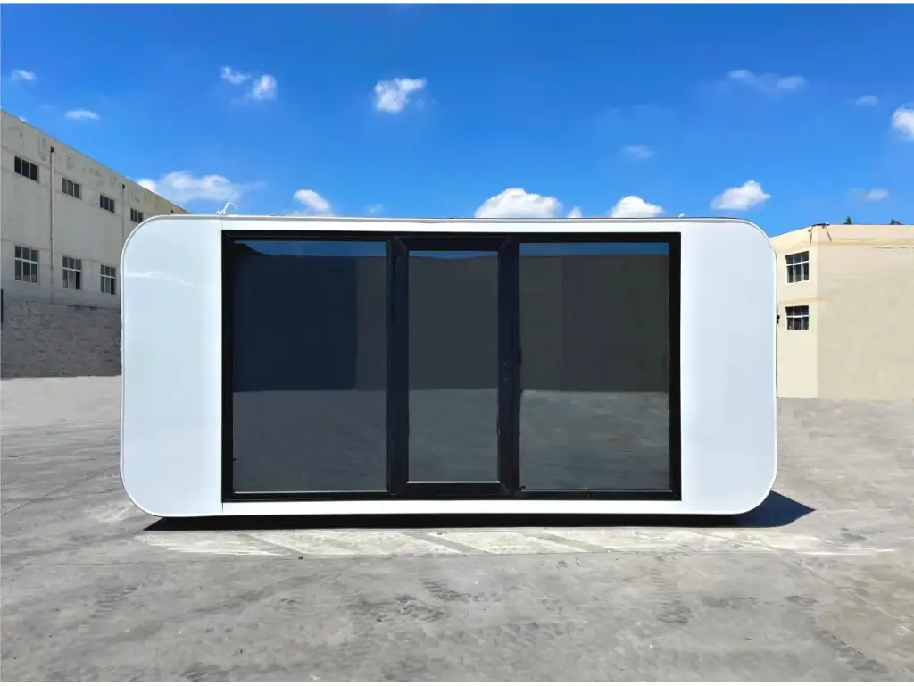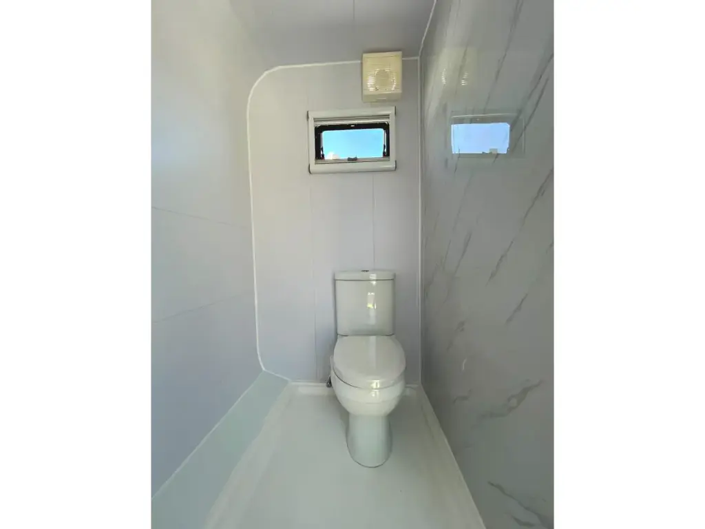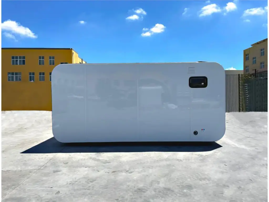 Paredes e teto isolados; caixilharia de alumínio com vidros duplos de controlo solar; fechadura com chave e cilindro; janela de guilhotina; dimensões para transporte 4950x2300x2450 mm (CxLxA); vista superior; caixilharia inferior; equipado com orifícios para colheres e pés ajustáveis; sem uso; Interior: casa de banho com chuveiro; sanita; lavatório com torneira misturadora e armários de base; espelho com 3 opções de iluminação; ventilador; tomadas de parede de 220 volts com ligação USB; luz de teto LED; 2 janelas de guilhotina com persianas e redes mosquiteiras; cortina; cama com espaço de arrumação; DR (Disjuntor Diferencial Residual); arrumação em armários; (excluindo acessórios) Materiais externos: Painel composto de alumínio; chapa de alumínio de camada única com fluorocarbono branco; dupla camada leve de alta resistência à compressão Materiais internos: Placa plana de madeira-plástico com puxador; placa ecológica de grau HE; sem uso