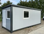 Este contêiner de escritório de 6,00 m de comprimento por 2,40 m de largura é uma solução modular completa, ideal para um escritório independente com banheiros e área de cozinha , perfeitamente adequado para canteiros de obras, escritórios temporários ou locais isolados.