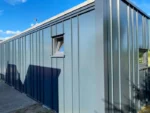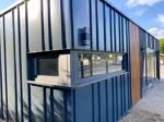 Revestimento exterior: madeira, compósito ou metal, resistente às intempéries.
