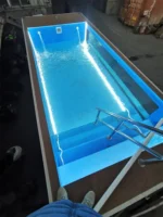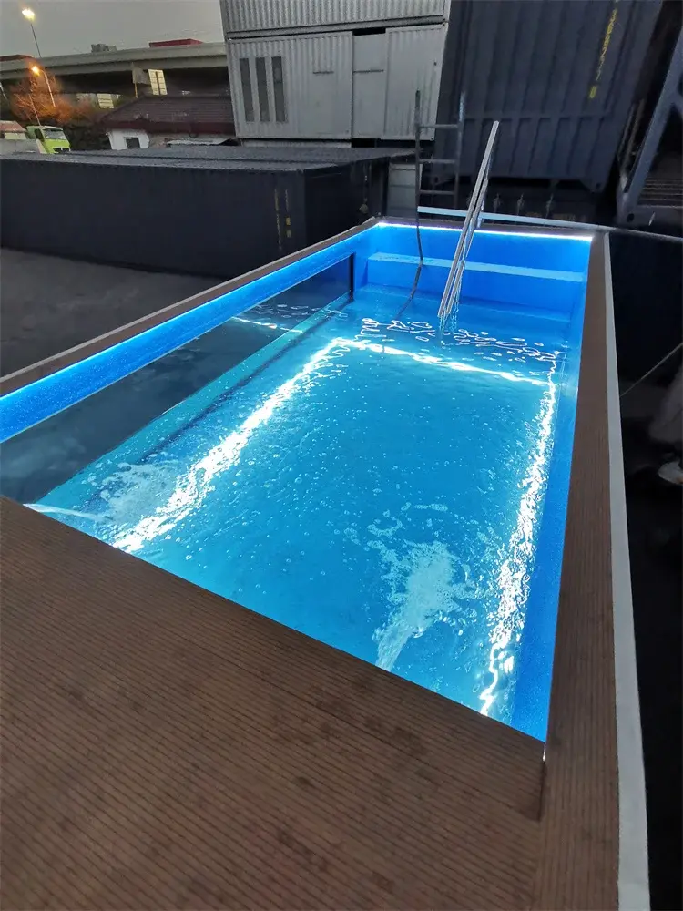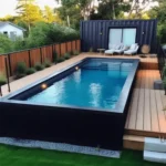 Piscina container com parede interna. Combinando um design industrial chique e inovador, esta piscina container oferece uma alternativa única e elegante às piscinas tradicionais. Perfeita para quem busca um elemento central que chame a atenção, inclui uma escada personalizada para fácil acesso e um toque de sofisticação.