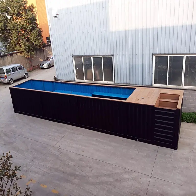 Piscina externa feita a partir de um contêiner marítimo de 40 pés , modificado e pré-fabricado em fábrica . Estrutura de aço reforçado, design móvel , instalação rápida e baixa manutenção. Ideal para residências, hotéis e projetos comerciais.