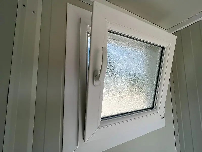 2x WC com lavatório, 2x portas de vidro fosco, 2x ventilação