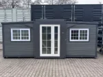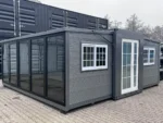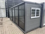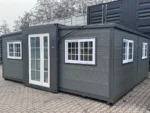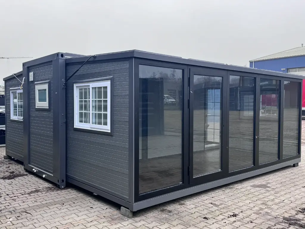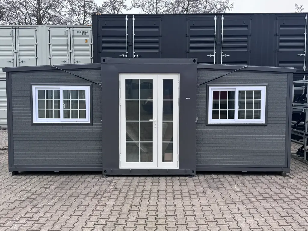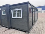 Mini casa/habitação, base fixa de 5,80m/2,00m/2,50m, duas portas de vidro dobráveis ​​criam uma dimensão externa de 5,80m/6,00m/2,50m, área habitável/utilizável de aproximadamente 34,80 metros quadrados, o piso pode ser nivelado utilizando os pés integrados no subpiso. Ligações de água e esgoto, ventilação, janelas e portas já instaladas. Peso total: 3500 kg, Condição: Nova/Desabitada