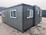 Equipada com paredes e teto isolados, fachada de vidro de luxo com porta, dois cômodos independentes com fechadura (por exemplo, para dois quartos; parede divisória inclusa), cozinha americana com armários suspensos, banheiro com vaso sanitário e chuveiro tipo ducha, lavatório com armário e acessórios de banheiro, piso vinílico e sistema de ventilação (conexão 230V). Pontos de conexão para iluminação de teto (incluindo luminárias), caixilhos de PVC com vidros duplos, calha de drenagem, fechadura com chave e cilindro, luminárias de teto (inclusas), tomadas e interruptores. Dimensões aberta: 5791 x 6096 mm; dimensões fechada (dimensões para transporte): (C x L x A) 5860 x 2110 x 2550 mm; sem uso.