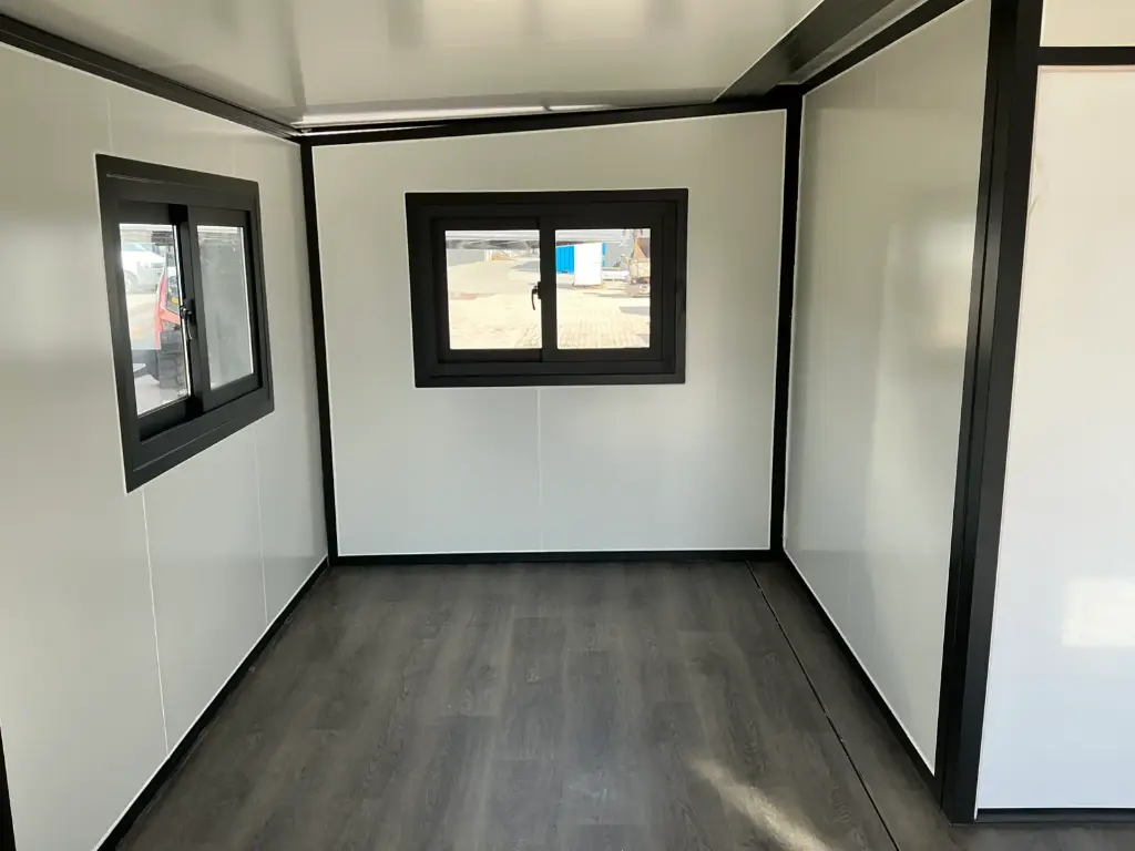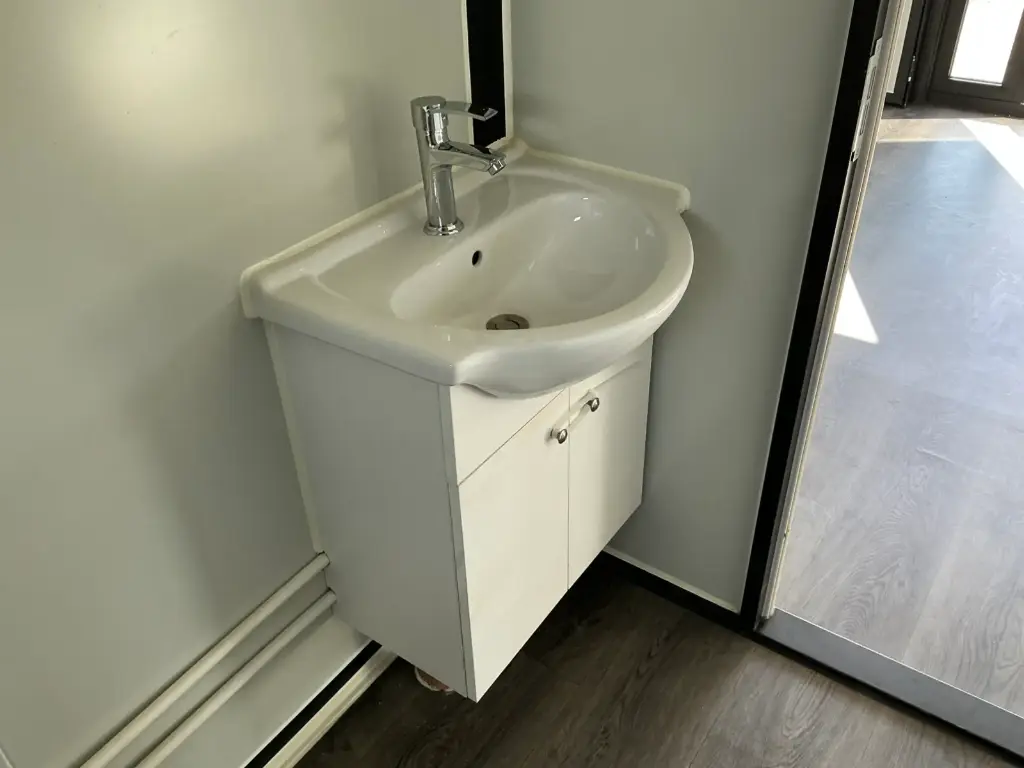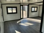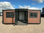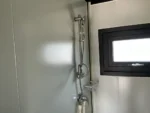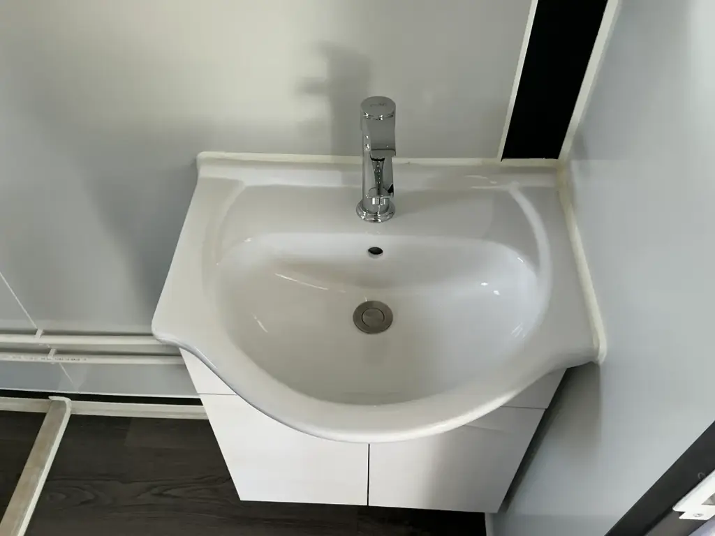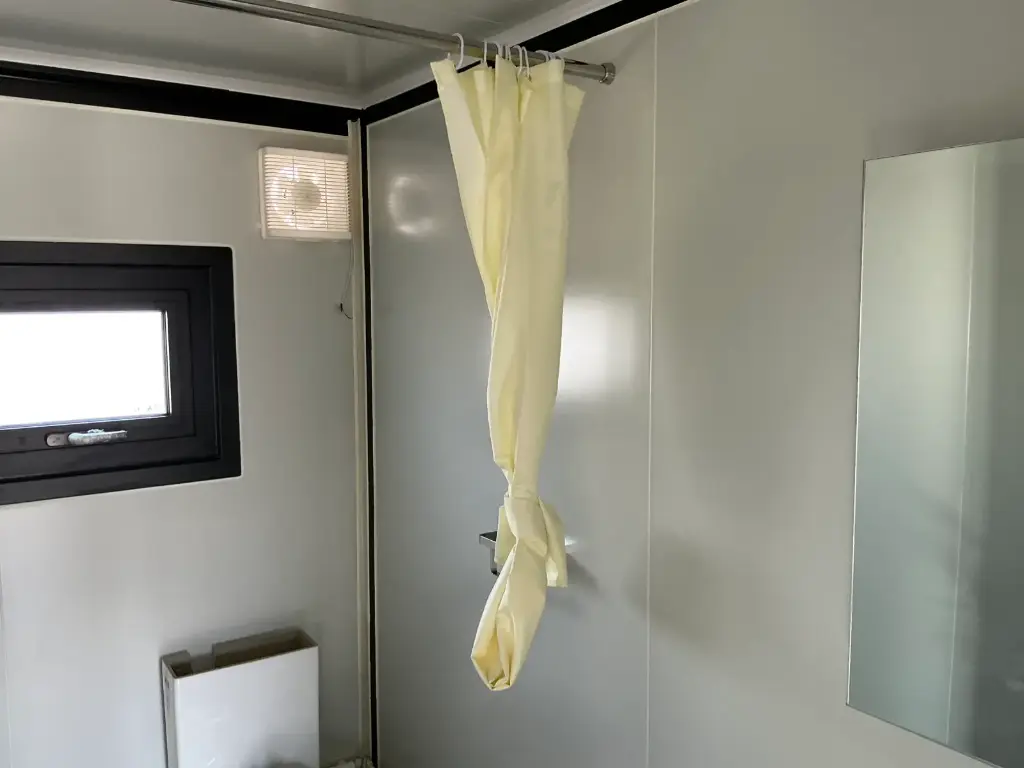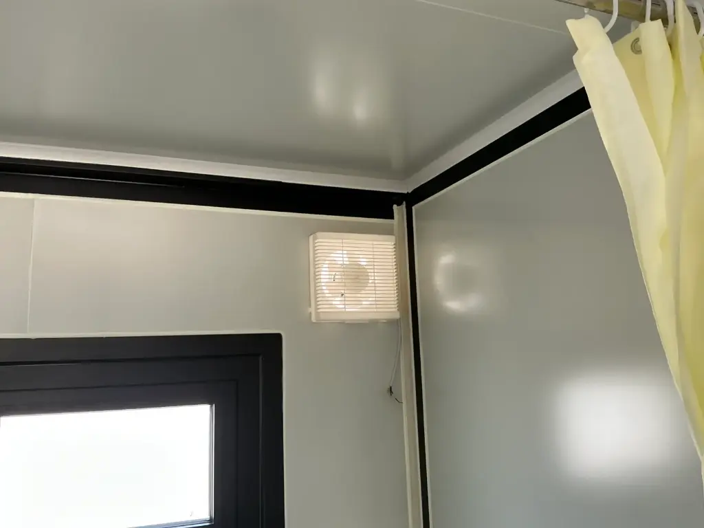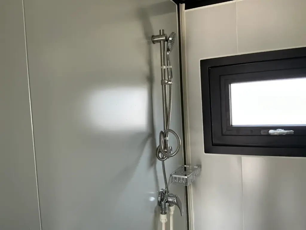 Equipada com paredes e teto isolados, banheiro com vaso sanitário e chuveiro, pia com armário e espaço para armazenamento, piso vinílico, banheiro com ventilador, hall de entrada e toldo. Dimensões aberta: 5791×6096 mm; dimensões fechada (dimensões para transporte): (CxLxA) 5860x2110x2550 mm; sem uso.