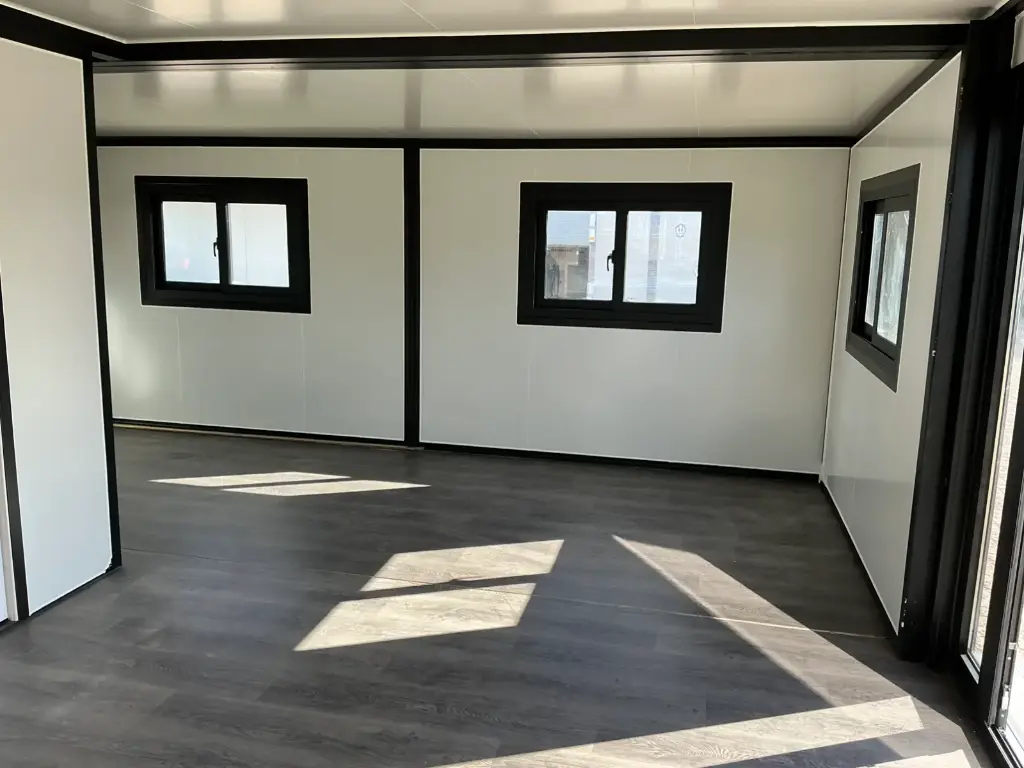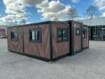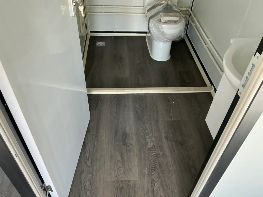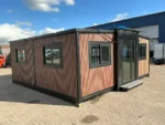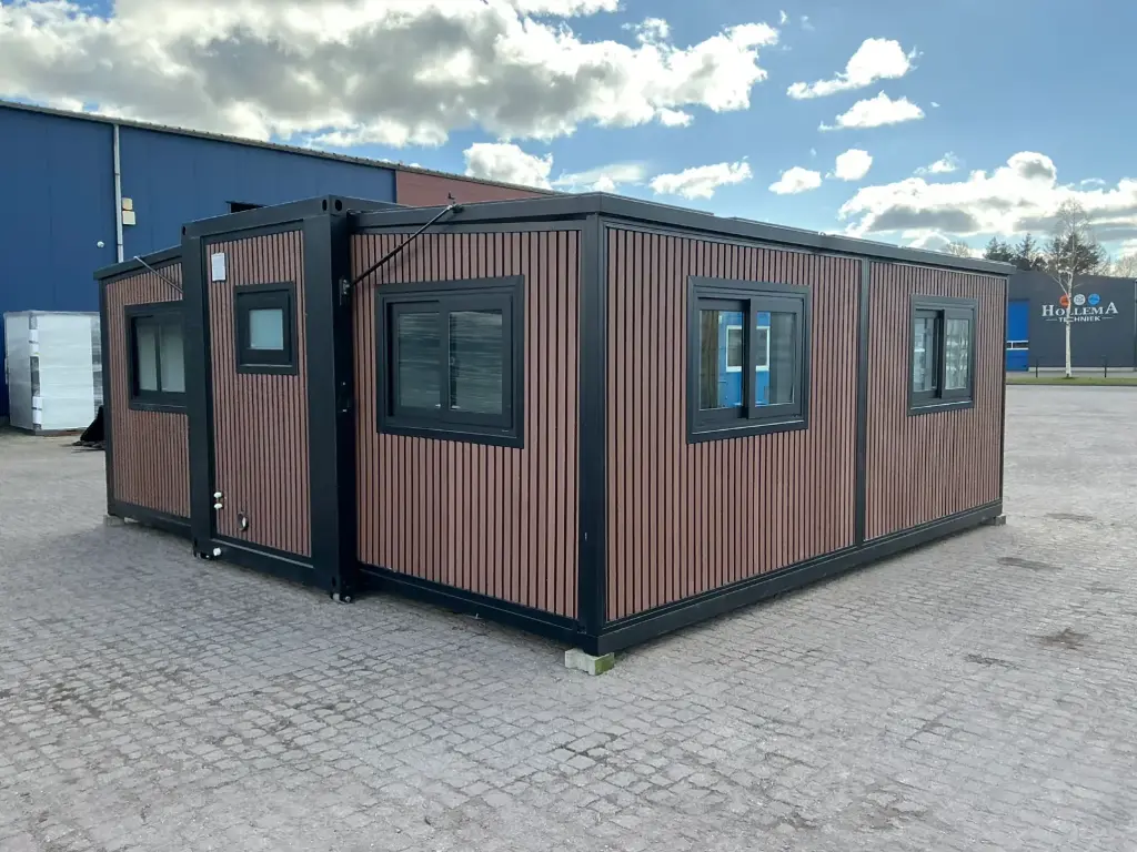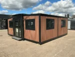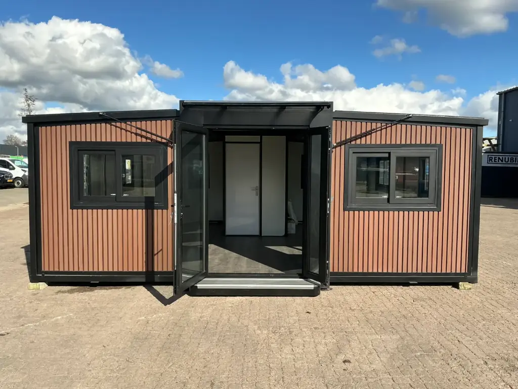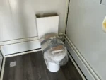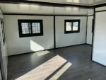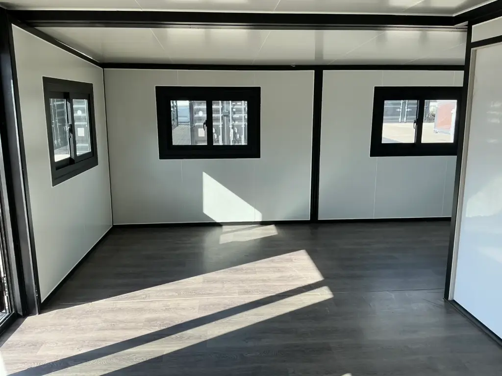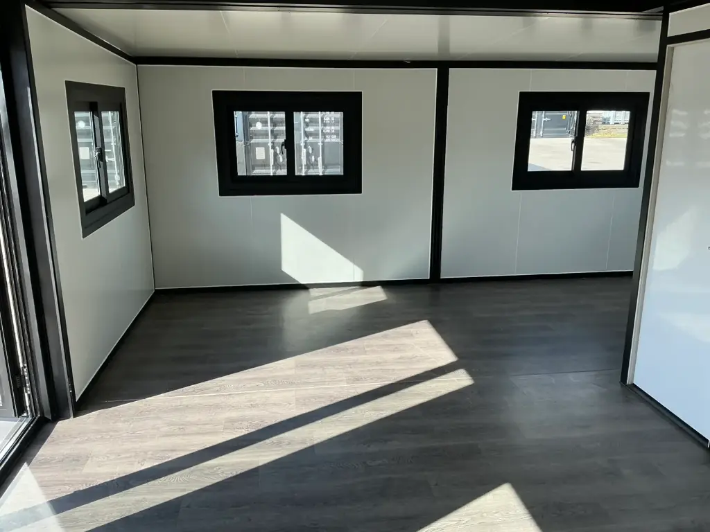 Equipada com paredes e teto isolados, banheiro com vaso sanitário e chuveiro, pia com armário e espaço para armazenamento, piso vinílico, banheiro com ventilador, hall de entrada e toldo. Dimensões aberta: 5791×6096 mm; dimensões fechada (dimensões para transporte): (CxLxA) 5860x2110x2550 mm; sem uso.