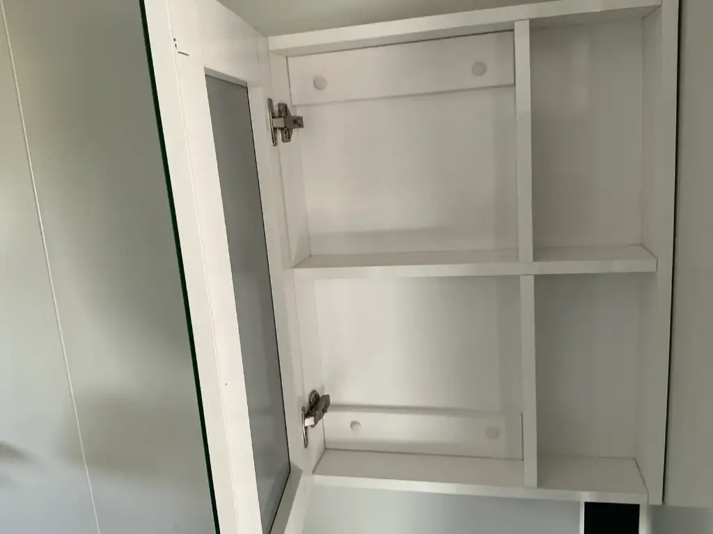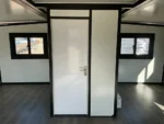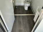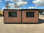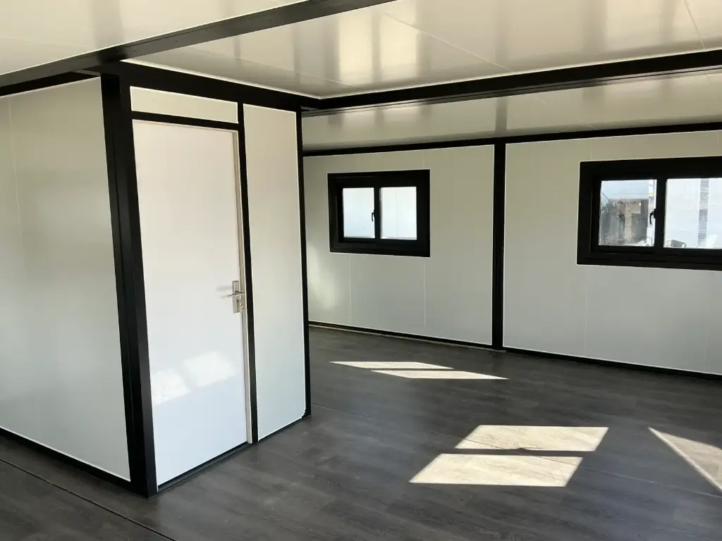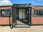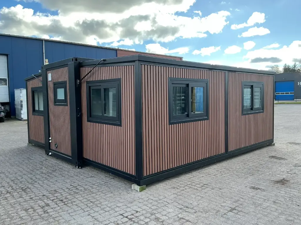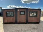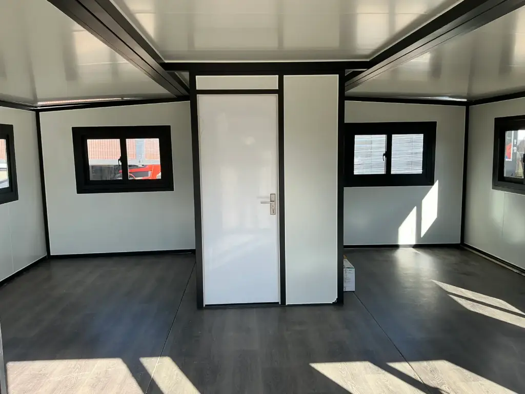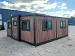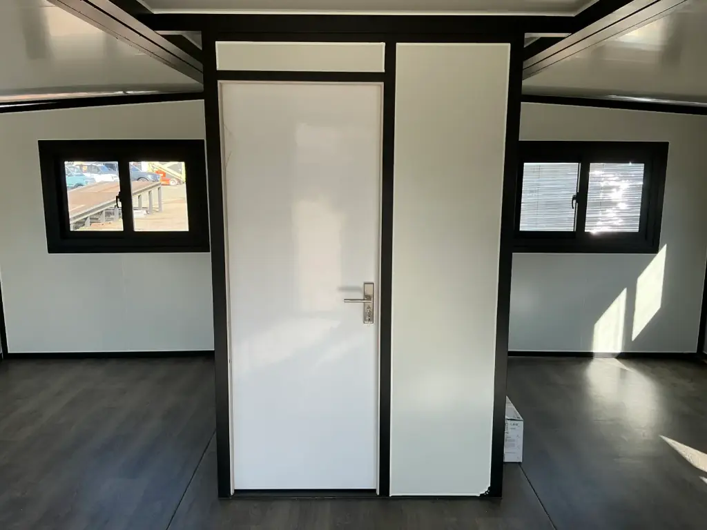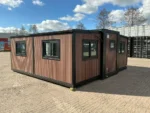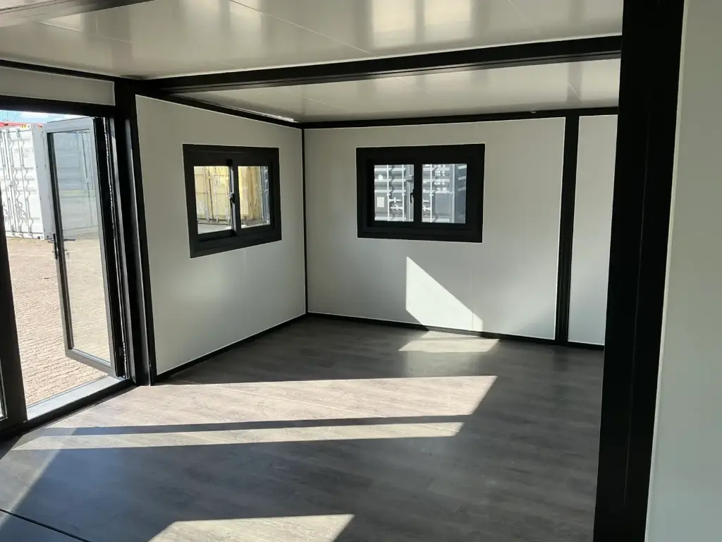 Equipada com paredes e teto isolados, banheiro com vaso sanitário e chuveiro, pia com armário e espaço para armazenamento, piso vinílico, banheiro com ventilador, hall de entrada e toldo. Dimensões aberta: 5791×6096 mm; dimensões fechada (dimensões para transporte): (CxLxA) 5860x2110x2550 mm; sem uso.