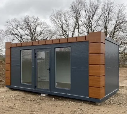 Contêiner de escritório com design em madeira, 6×2,40 metros, 2,70 metros de altura.